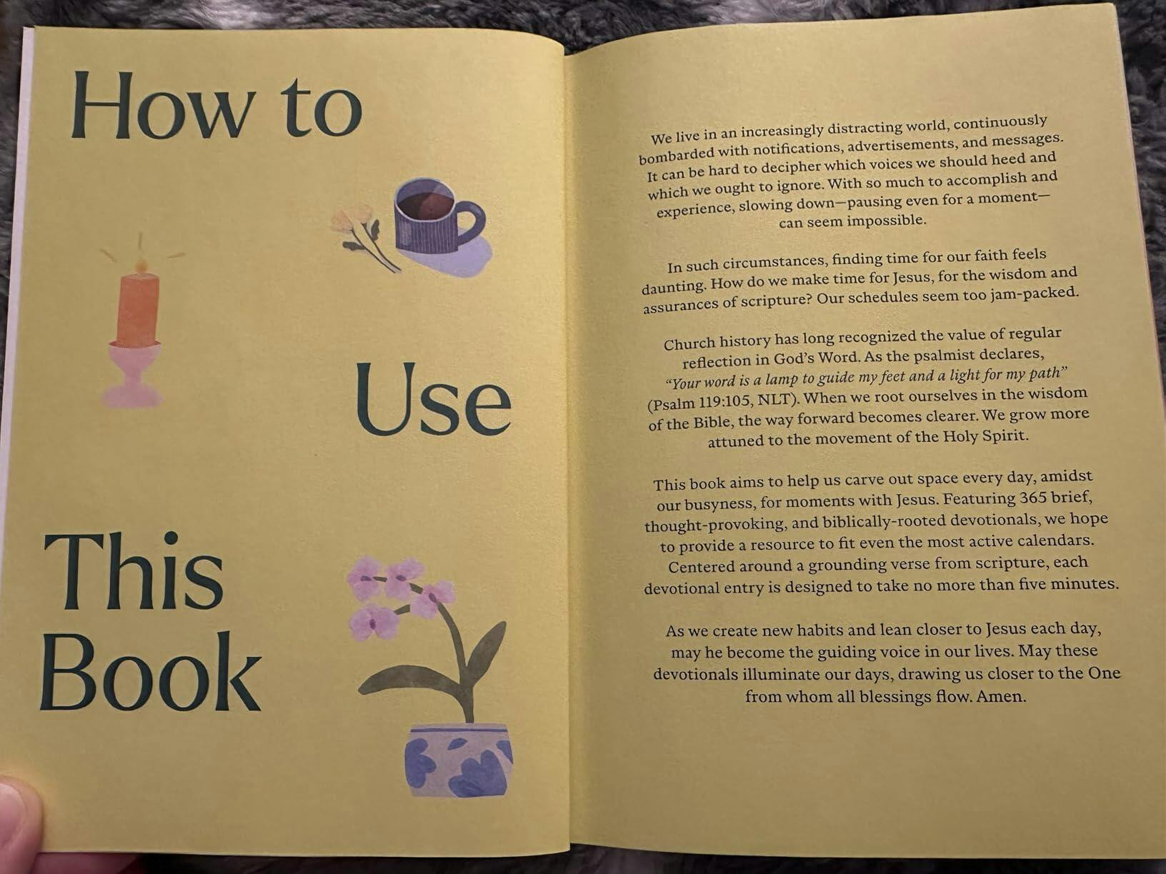 It is a perfect book to guide us throughout the year - scripture with a an easy to understand message & the hardcover has nice textures on the cover.