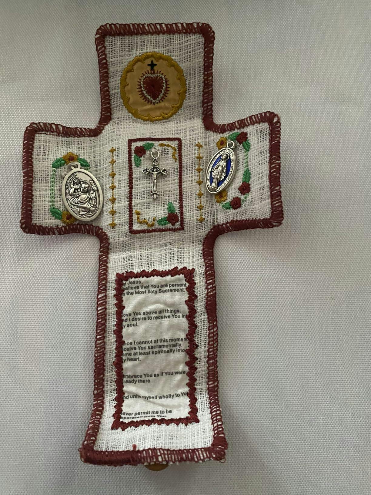 This is a charming pocket altar that includes the Eucharistic prayer for when you are not able to go to Mass. It is sweetly made out of red velvet and includes a crucifix, a St. Christopher medal, and a Miraculous medal. It is a perfect item to slip into a pocket or purse for traveling or visiting someone in the hospital. You have everything you need for a quick mini-service/prayer time. It can turn any small space into a sacred space. It is such a lovely item for yourself or a gift to someone who is homebound.