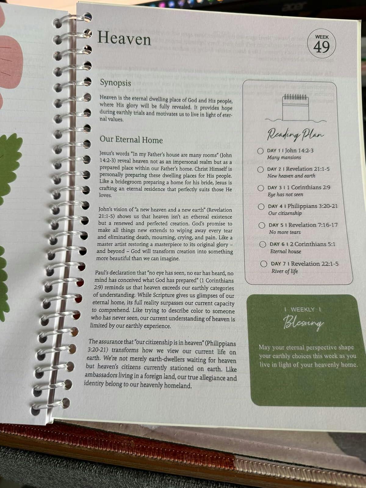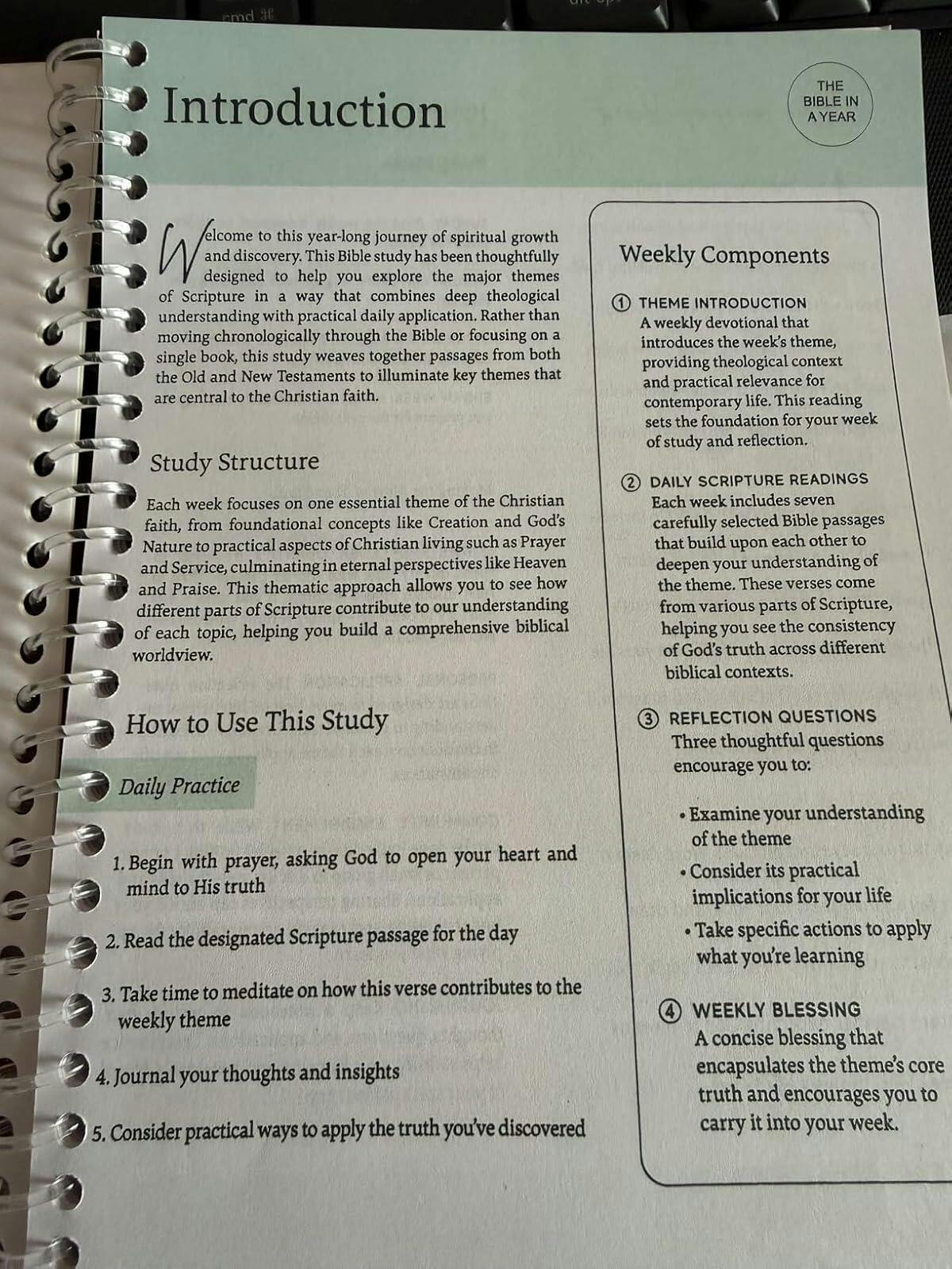 Love following the weekly reading. Takes only minutes to read daily. Great questions to answer at the end of each week.